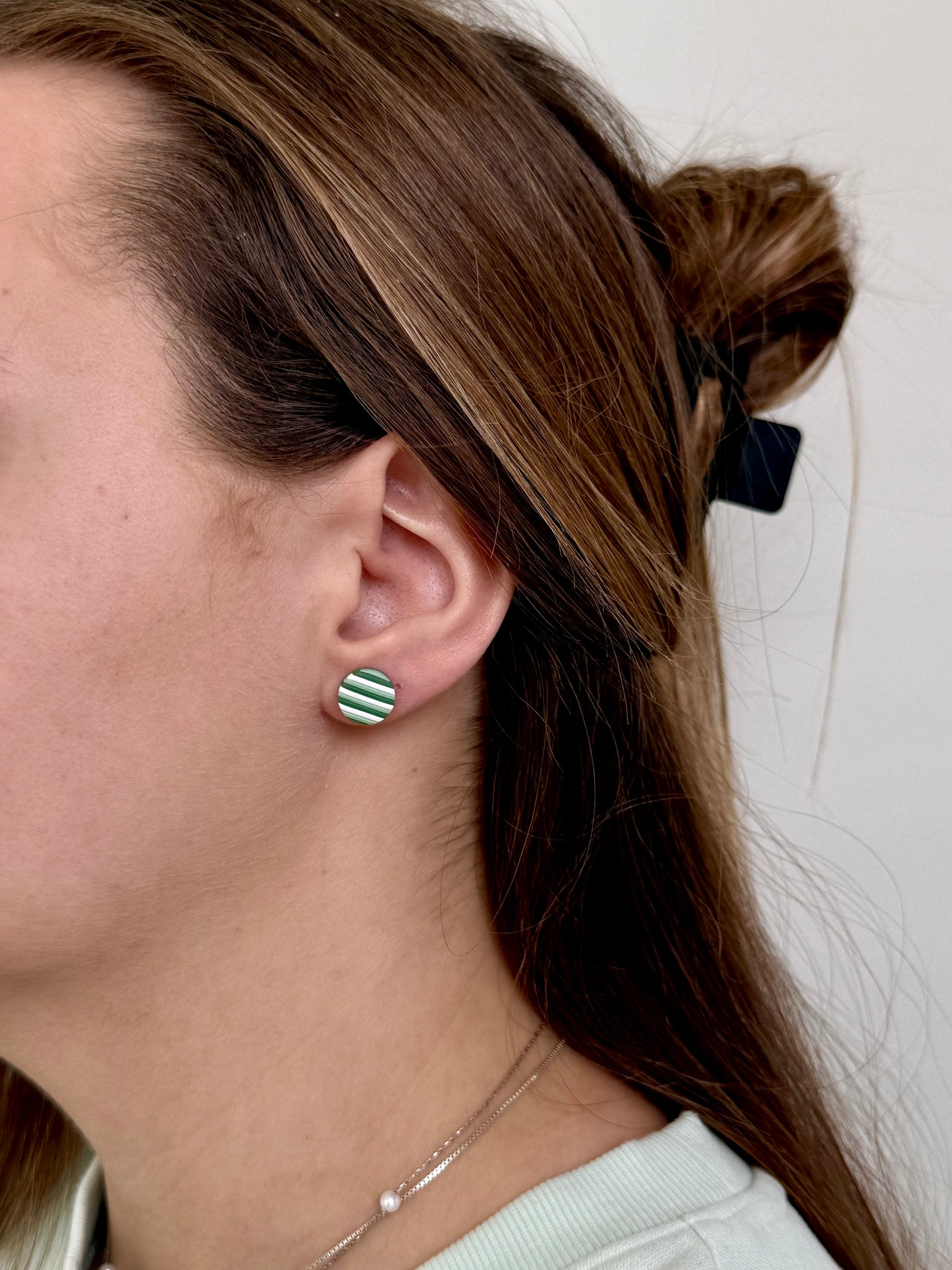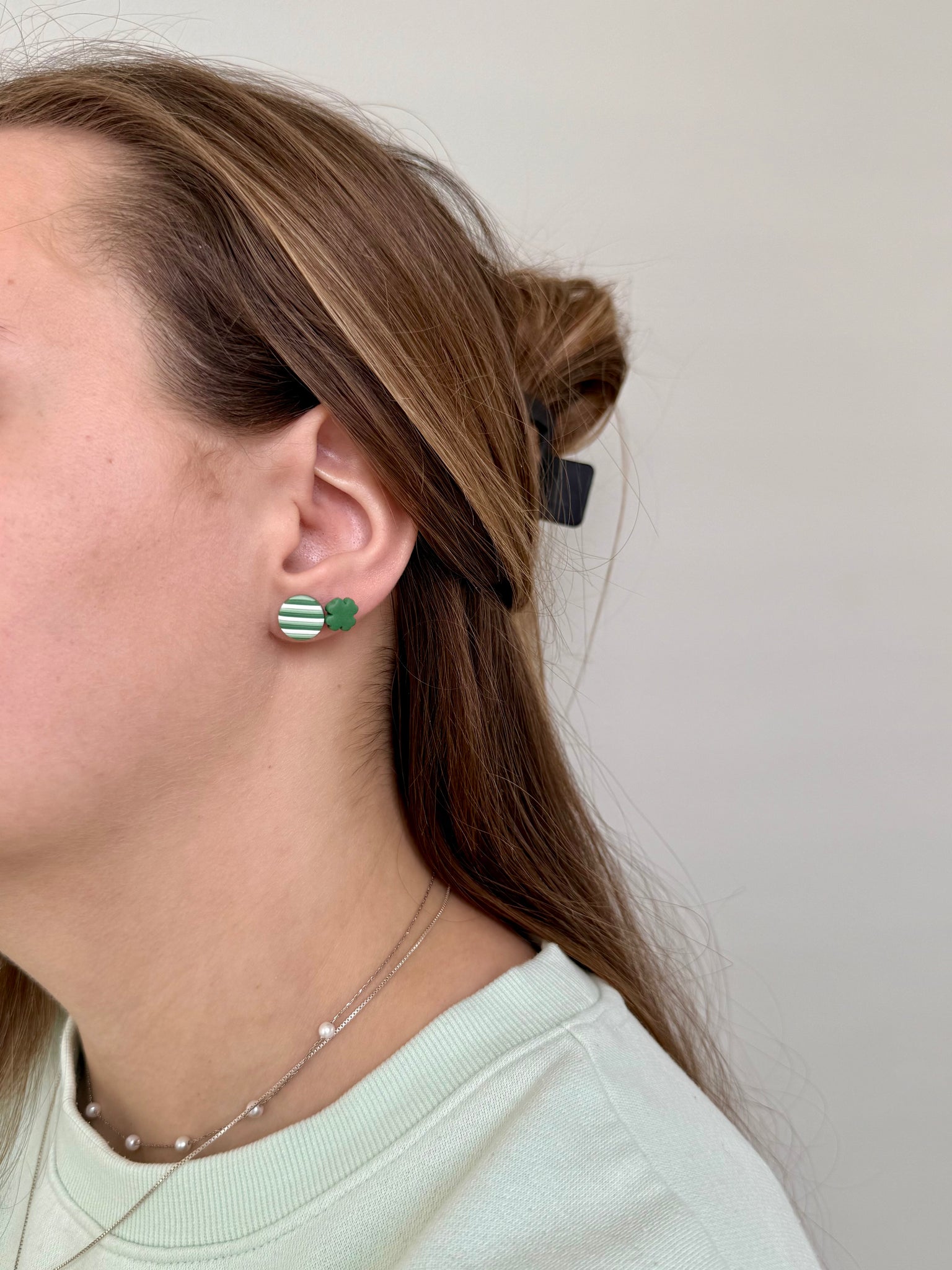 Includes a pair of mini shamrock studs and green striped circle studs
