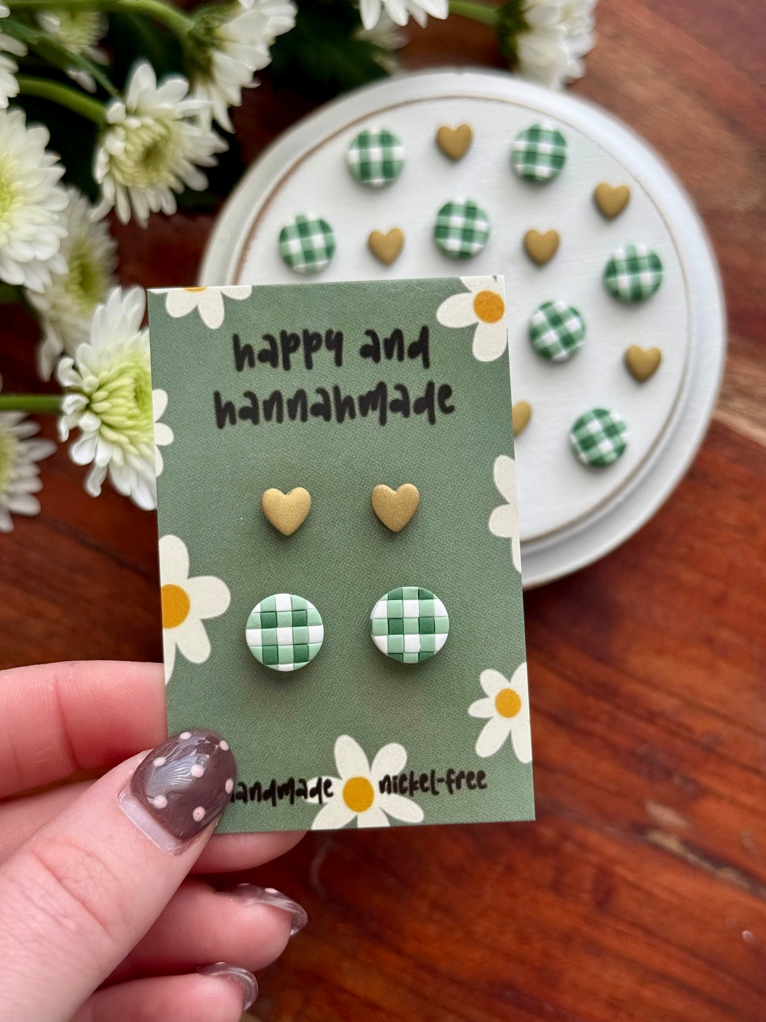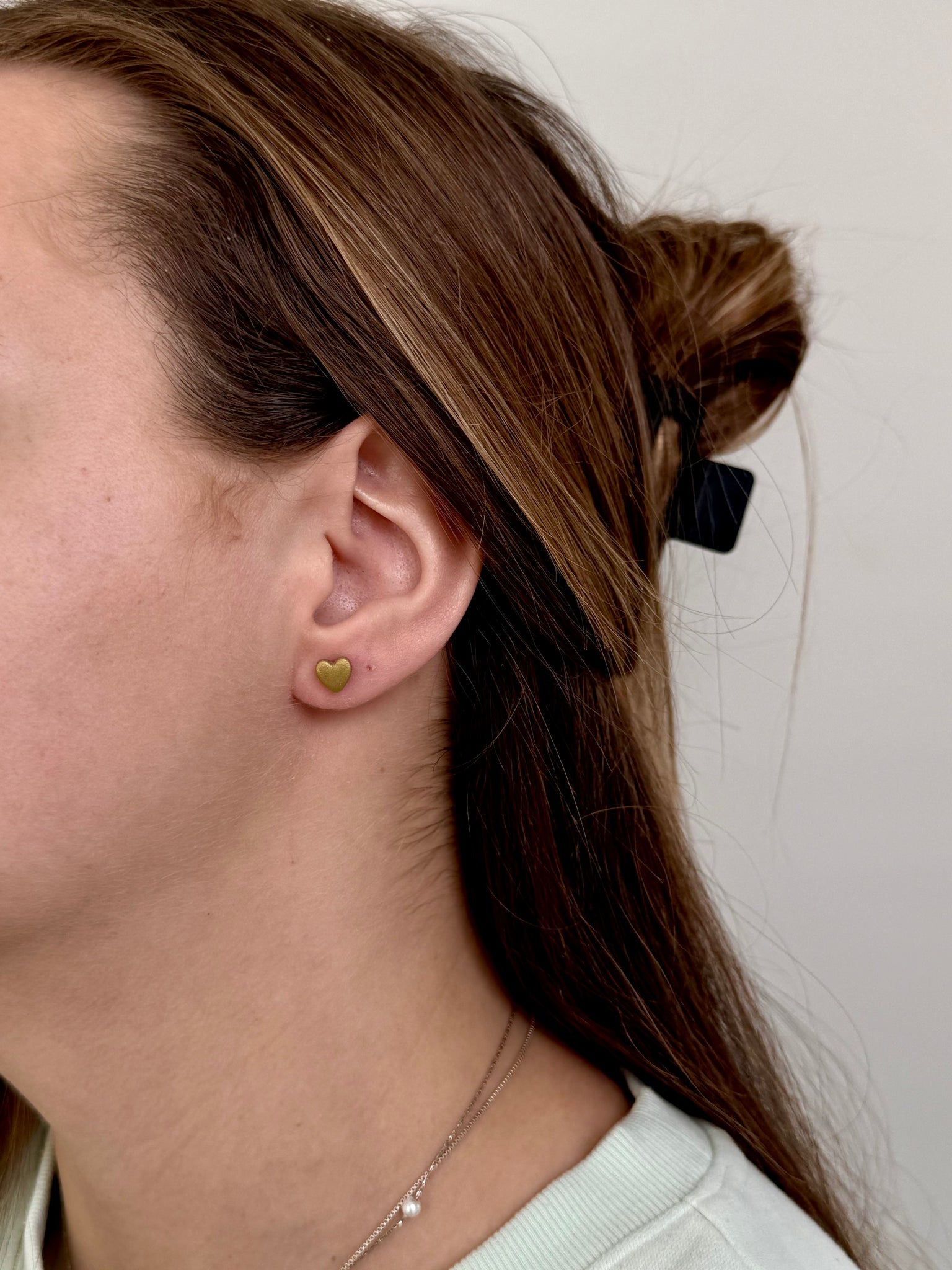 Mini gold heart stud measures 0.50 cm/5 mm and gingham stud measures 1 cm/10 mm